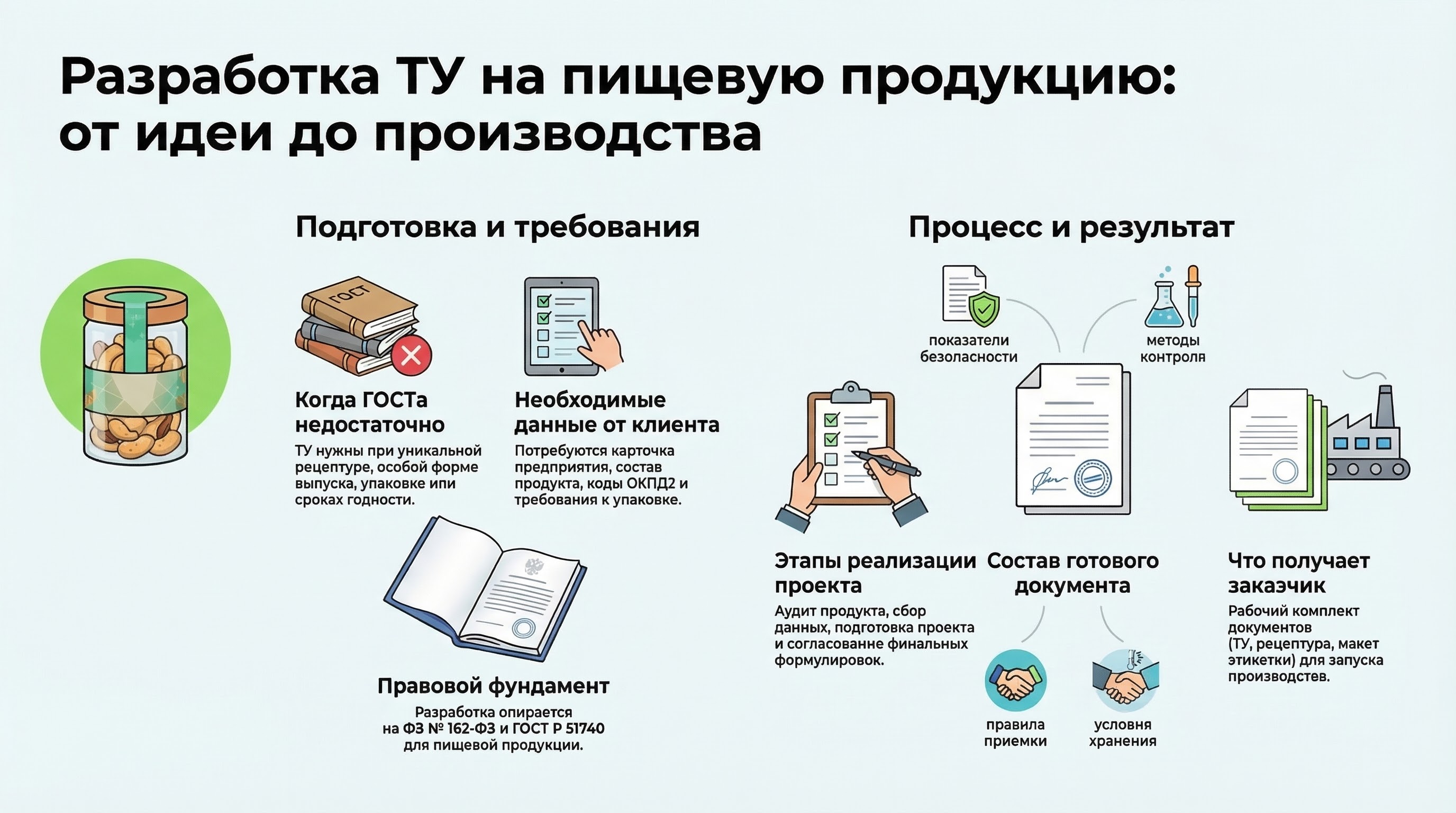 Помогаем понять, нужны ли технические условия для вашей пищевой продукции, и разрабатываем документ под реальный состав, технологию, упаковку и условия выпуска.